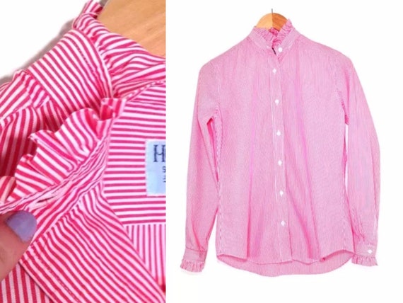 Vintage 1960s Hilditch Key Candy Cane Red And White Striped Button Up Long Sleeved Ruffle Collar Wrist Shirt Secretary Preppy Womens Small